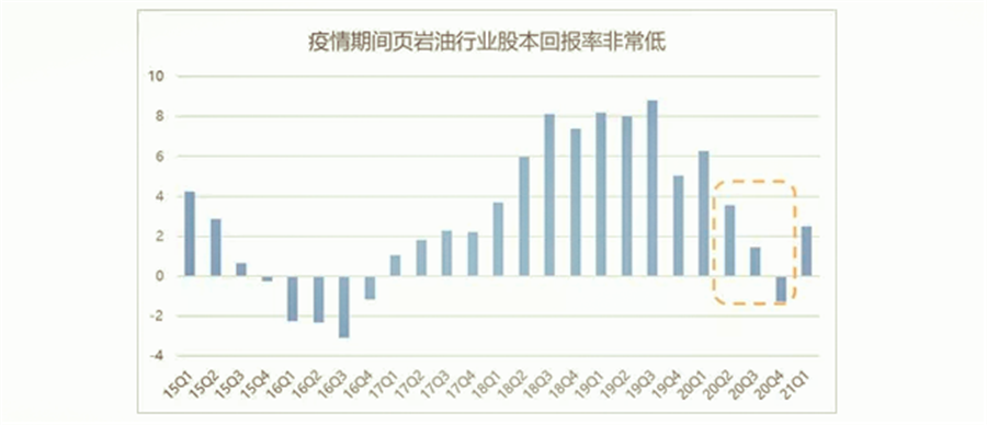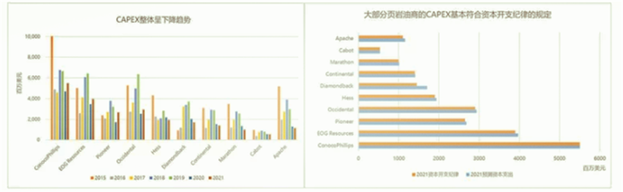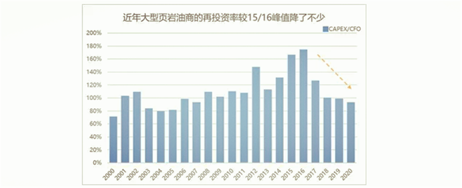 這些其實(shí)都可以說(shuō)明,后疫情時(shí)代,頁(yè)巖油行業(yè)的經(jīng)營(yíng)行為發(fā)生了改變,對疫情的不確定使得企業(yè)對于增產(chǎn)行為更加謹慎;巨大的債務(wù)壓力下,頁(yè)巖油企業(yè)需要將營(yíng)收優(yōu)先用于償還債務(wù)以及回報股東,因此CAPEX的投入會(huì )減少;同時(shí)在政策導向的指引下,長(cháng)周期來(lái)看資本投資偏好也會(huì )發(fā)生改變。