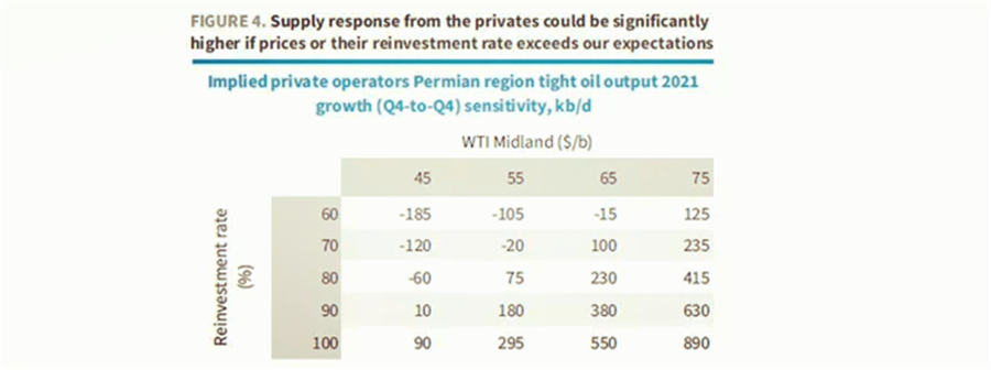 按照巴克萊的模型,若WTI維持在65刀或更高的水平,二疊紀的私營(yíng)頁(yè)巖油企業(yè)更有提高Reinvestment rate的意愿,若將其提高至70%,那么到Q4,僅二疊紀的增量就有10萬(wàn)桶/天,整體增量在50-60萬(wàn)桶/天。
