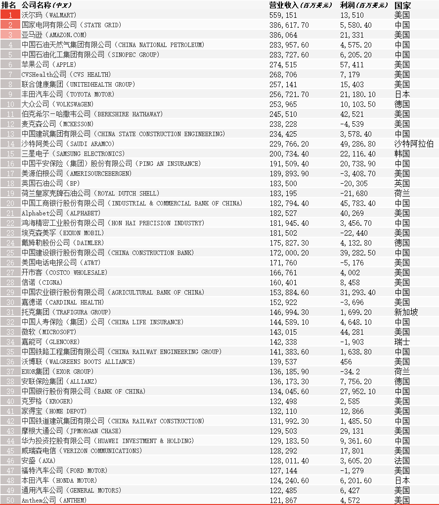 8月2日,《財富》世界500強排行榜發(fā)布。受新冠疫情影響,今年《財富》世界500強排行榜企業(yè)的營(yíng)業(yè)收入約為31.7萬(wàn)億美元,比去年下降5%。今年,沃爾瑪連續第八年成為全球最大公司,中國的國家電網(wǎng)公司上升至第二位,亞馬遜首次進(jìn)入前三,蘋(píng)果公司前進(jìn)至第6位。