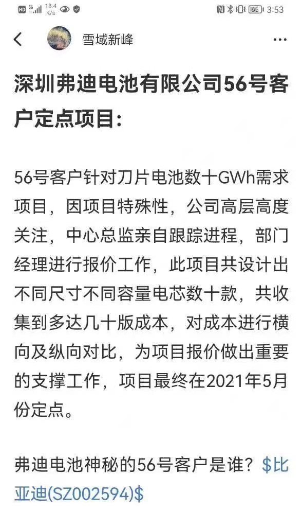 近期,有消息稱(chēng)比亞迪在安徽成立了一家新的電池公司,項目已經(jīng)開(kāi)工。隨著(zhù)大量新電池產(chǎn)能增加,坊間傳言稱(chēng)比亞迪迎來(lái)重要的“56號客戶(hù)”。