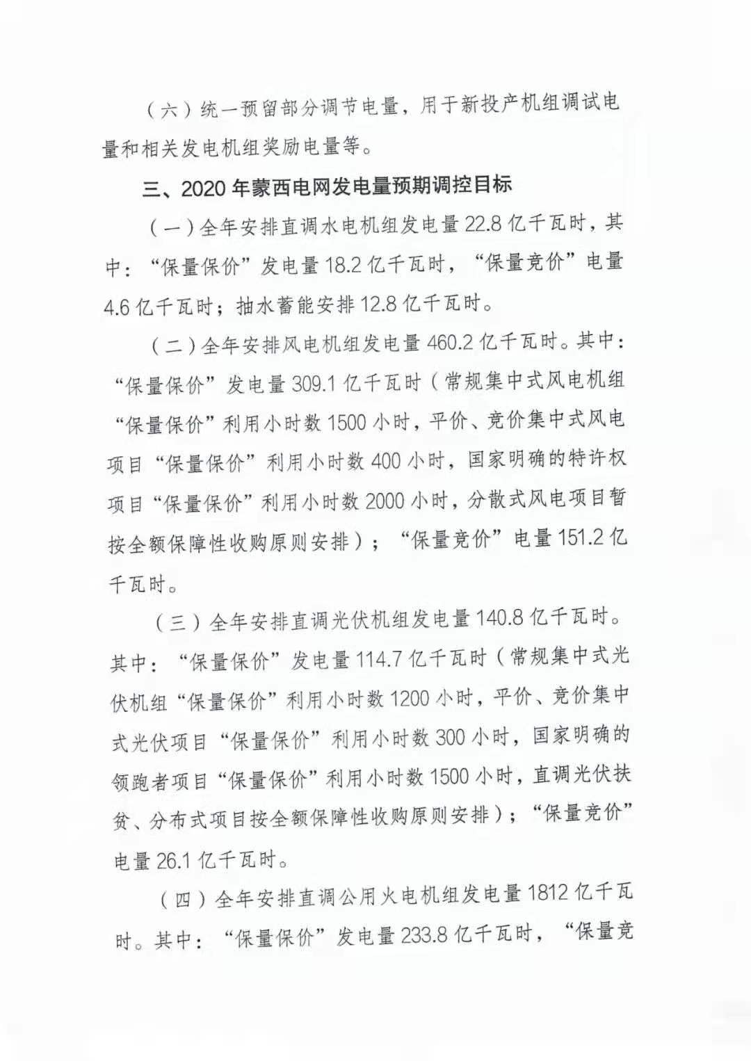 對比蒙西《2020年度內蒙古西部電網(wǎng)發(fā)電量預期調控目標》文件,風(fēng)電方面,全年安排風(fēng)電機組發(fā)電量415億千瓦時(shí)。其中:基數保障發(fā)電量302億千瓦時(shí)(常規集中式風(fēng)電機組基數保障利用小時(shí)數1500小時(shí),特許權項目基數保障利用小時(shí)數2000小時(shí),分散式風(fēng)電項目按全額保障性收購原則安排);市場(chǎng)交易電量113億千瓦時(shí)。