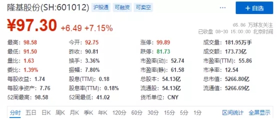 在公布半年報的消息刺激下,隆基今日股價(jià)大漲7.15%,收盤(pán)報97.30元,再度創(chuàng )下股價(jià)新高,總市值達到5266.80億元。