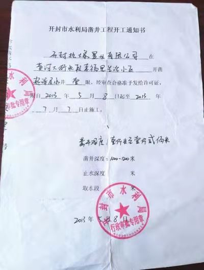 開(kāi)封市水利局審批的井深為1000至1200米