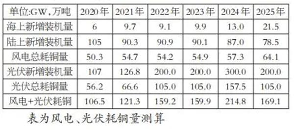 結合兩家統計取均值,預計海上風(fēng)電每GW裝機需要消耗12650噸銅,陸上風(fēng)電每GW裝機需要消耗4700噸銅,光伏系統每GW裝機需要消耗5250噸銅。