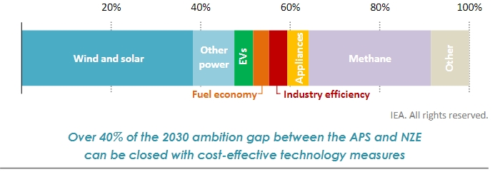 2030年已宣布的承諾方案中和凈零排放情景之間超過(guò)40%的目標差距可以通過(guò)具有成本效益的技術(shù)措施來(lái)彌補