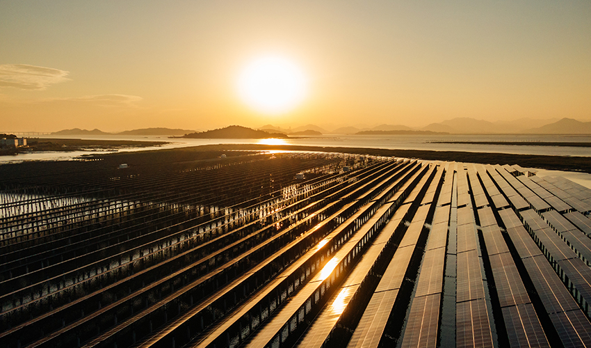落日余暉中的玉環(huán)華能清港灘涂漁光互補光伏電站。陳維益攝