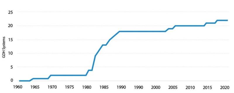 在美國,地熱區域供暖項目最初是在高品位水熱型地熱資源附近開(kāi)發(fā)的,但該技術(shù)正在向中-低品位水熱型地熱資源地區擴展。目前,美國共有23個(gè)地熱區域供熱系統,總容量超過(guò)75MWth。