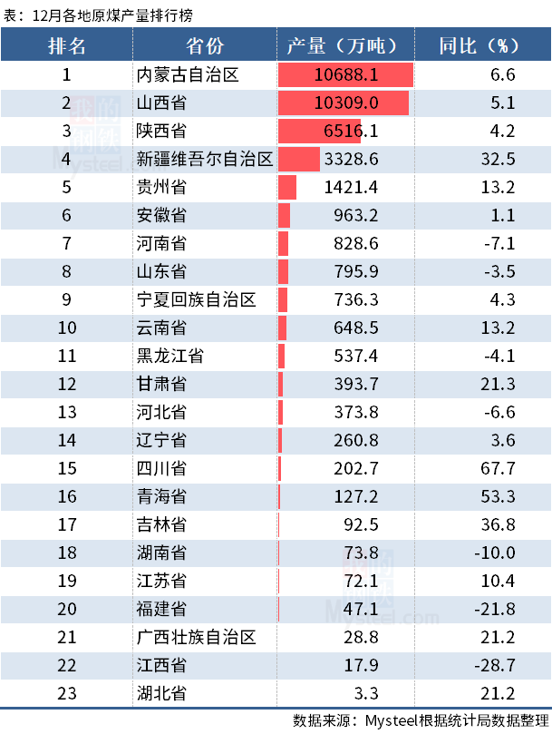 日前,國家統計局數據顯示,2021年12月,全國原煤產(chǎn)量38466.8萬(wàn)噸,同比增長(cháng)7.2%;1-12月累計原煤產(chǎn)量407136萬(wàn)噸,同比增長(cháng)4.7%。