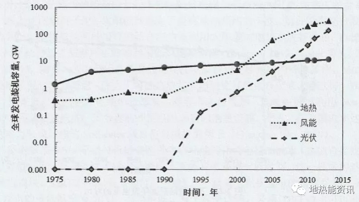 圖1 地熱、風(fēng)力和太陽(yáng)能發(fā)電進(jìn)程對比(據李克文)