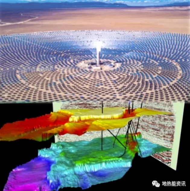 2020年世界地熱大會(huì )有論文提出了地下儲熱超超臨界發(fā)電的研究設想(圖2)。計劃利用廣大地面的太陽(yáng)能集熱(如太陽(yáng)能熱發(fā)電),將聚熱塔收集的高熱不是當即用于發(fā)電,而是將高熱儲存到地下熱儲。水的超臨界點(diǎn)是溫度374℃和壓力220巴,太陽(yáng)能聚熱溫度可高達600℃構成超超臨界,這樣的高熱補充和增強了現有的高溫熱儲,用來(lái)發(fā)電就比現有的地熱發(fā)電系統效率更大大提高了?,F有地熱田的地下熱儲是天然的,不需要干熱巖那樣靠壓裂來(lái)人造熱儲(太困難了);現有熱儲的溫度不夠高,就靠太陽(yáng)能聚熱來(lái)注入增溫。該設想已經(jīng)用數學(xué)模型擬合,是有可能實(shí)現的,這樣就增加了原顯不夠的地熱資源,就可以充分發(fā)揮“地熱+”的效益了。