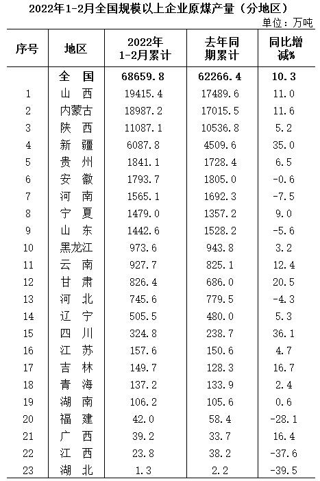 國家統計局數據顯示,1-2月全國原煤產(chǎn)量68659.6萬(wàn)噸,同比增長(cháng)10.3%。