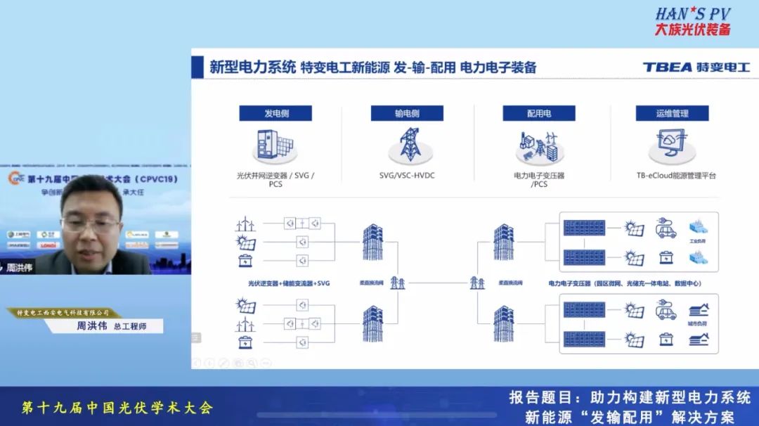 特變電工新疆新能源股份有限公司周洪偉參加此次活動(dòng),并發(fā)表題為《助力構建新型電力系統,新能源“發(fā)輸配用”解決方案分享》主題報告,分享在新型電力系統下,發(fā)電側、輸電側、配電側的電力電子裝備解決方案。