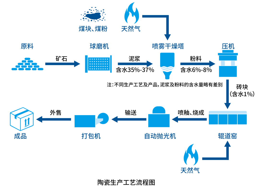 上圖為陶瓷典型生產(chǎn)工藝,原料經(jīng)由球磨機制為泥漿,再由噴霧干燥塔烘干為粉料,粉料經(jīng)由壓機成型,由輥道窯噴釉燒成,最終拋光后形成成品。其中烘干是陶瓷生產(chǎn)工藝中非常重要的工序之一,不但關(guān)系著(zhù)陶瓷的產(chǎn)品質(zhì)量,而且影響陶瓷企業(yè)的能耗及排放,故干燥過(guò)程的環(huán)保、節能是關(guān)系到企業(yè)生產(chǎn)與發(fā)展的重大事項。