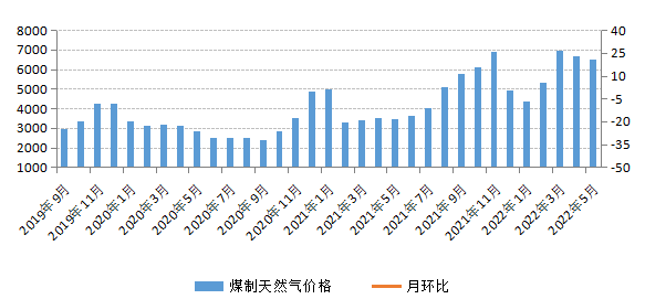一方面,5月份天然氣生產(chǎn)企業(yè)檢修較多,天然氣市場(chǎng)供應有所減少。另一方面,雖然“五一”過(guò)后道路交通逐步恢復,下游車(chē)用需求增加,終端用戶(hù)補貨積極,但是夏季是天然氣市場(chǎng)需求淡季,所以5月份天然氣市場(chǎng)需求整體不強,上游庫存有所積累。在供需兩弱的環(huán)境下,煤制天然氣市場(chǎng)價(jià)格繼續小幅回落。5月份煤制天然氣平均交易價(jià)格為6507.38元/噸,與4月份相比(下稱(chēng)環(huán)比),價(jià)格下降2.04%;與2021年5月份相比(下稱(chēng)同比),價(jià)格上漲87.56%。