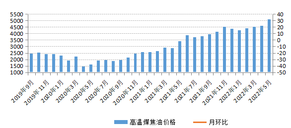 5月份,高溫煤焦油下游深加工、炭黑等行業(yè)開(kāi)工率明顯提升,特別是下游深加工產(chǎn)品煤瀝青市場(chǎng)行情較好,對高溫煤焦油的需求量較大。另外,隨著(zhù)疫情形勢的好轉,物流運輸逐漸恢復,市場(chǎng)交易氛圍漸濃,在多方利好因素的推動(dòng)下,煤制高溫煤焦油市場(chǎng)價(jià)格小幅上漲,并創(chuàng )下近年來(lái)新高水平。5月份,煤制高溫煤焦油平均交易價(jià)格為5068.56元/噸,環(huán)比上漲10.52%,同比上漲48.20%。