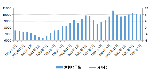 5月份,雖然PE下游包裝膜需求有所走強,企業(yè)補庫較為積極,但是農膜訂單明顯減少,管材需求也不及預期,PE農業(yè)、工業(yè)需求均處于淡季,在供需兩弱的環(huán)境下,煤制PE價(jià)格穩中略降。5月份,煤制PE平均交易價(jià)格為10007.78元/噸,環(huán)比略降0.86%,同比上漲9.83%。