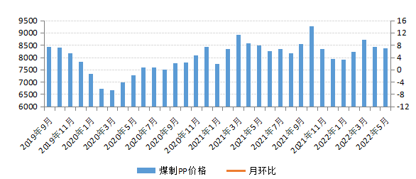 需求端看,5月份下游塑編、BOPP等企業(yè)采購積極性不高,PP下游需求整體偏弱,市場(chǎng)交易氛圍冷清。供應端看,除煤制工藝生產(chǎn)企業(yè)有小幅盈利外,其他工藝PP生產(chǎn)企業(yè)均以虧損為主,PP市場(chǎng)供應不高,庫存處于低位。在供需兩弱的環(huán)境下,煤制PP價(jià)格穩中略降。5月份,煤制PP平均交易價(jià)格為8349.38元/噸,環(huán)比略降0.82%,同比略降1.42%。