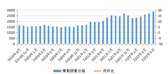 5月份,國內多地迎來(lái)用肥旺季,尿素農需集中釋放,企業(yè)出貨速度明顯加快,庫存處于低位水平。同時(shí),尿素出口等利好消息持續發(fā)酵,也進(jìn)一步助推了尿素市場(chǎng)行情的上漲。5月份,煤制尿素平均交易價(jià)格為2871.88元/噸,環(huán)比上漲6.37%,同比上漲40.83%。