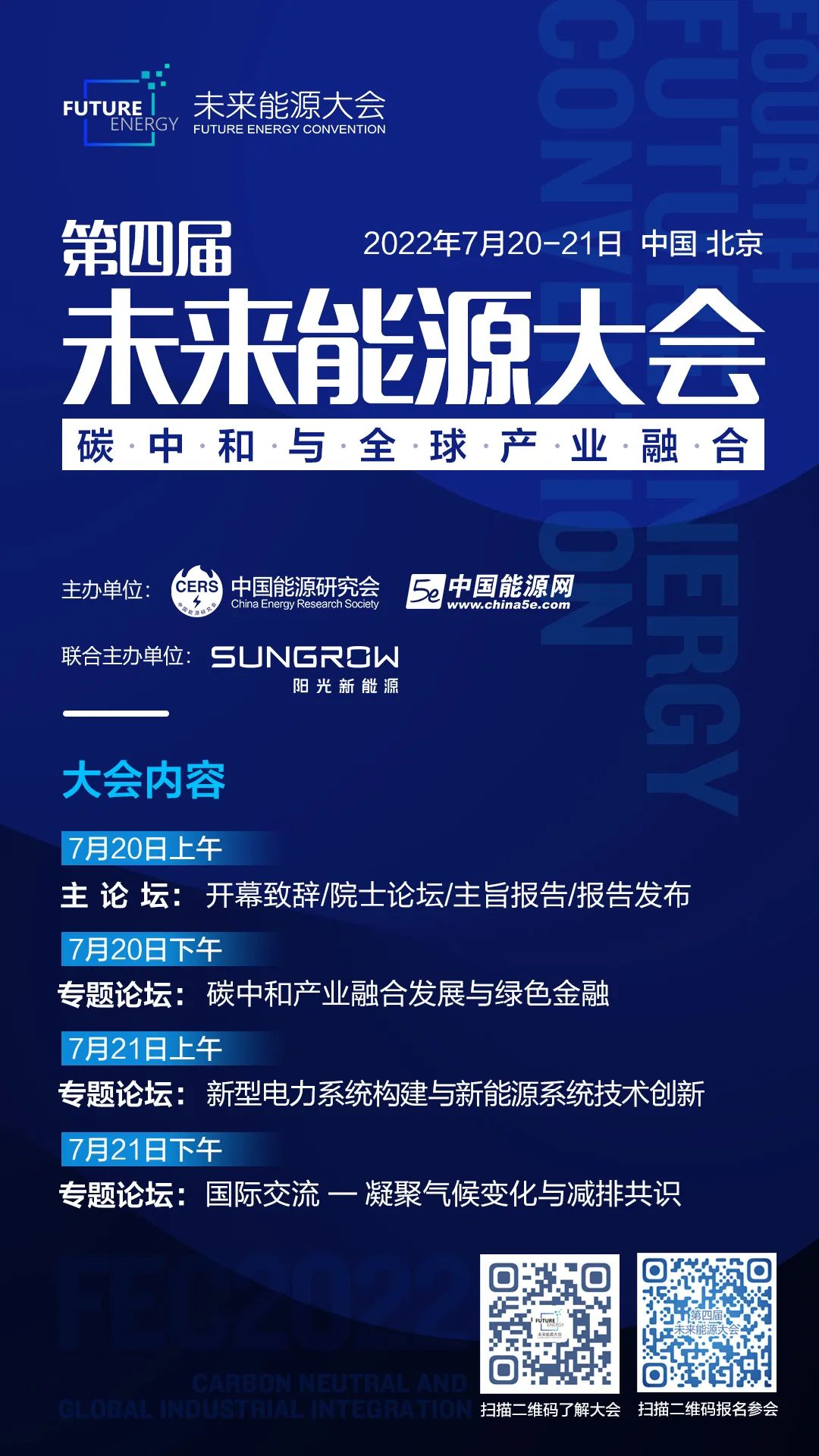 第四屆未來(lái)能源大會(huì )將突出未來(lái)能源系統及碳中和產(chǎn)業(yè)融合發(fā)展,創(chuàng )新產(chǎn)業(yè)新業(yè)態(tài),突出跨界融合、產(chǎn)業(yè)融合、區域融合形成的有機共生體系。2022年7月20日-21日,由中國能源研究會(huì )、中國能源網(wǎng)主辦,陽(yáng)光新能源開(kāi)發(fā)股份有限公司聯(lián)合主辦的第四屆未來(lái)能源大會(huì )在北京召開(kāi)。重關(guān)注碳中和產(chǎn)業(yè)融合與綠色金融,邀請來(lái)自國家電投集團,國家開(kāi)發(fā)銀行,中央財經(jīng)大學(xué),聯(lián)合信用管理有限公司等機構專(zhuān)家深度探討。