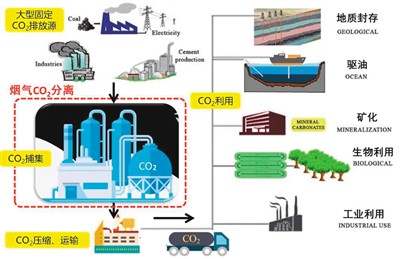 二氧化碳捕集、利用與封存過(guò)程示意圖。