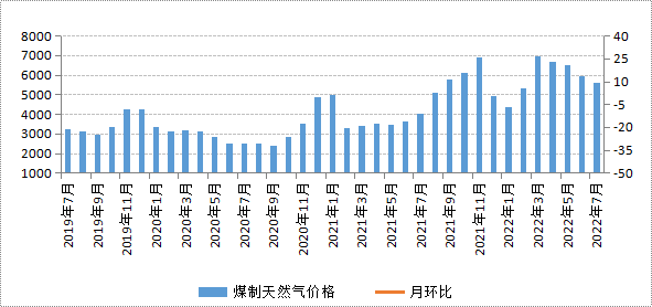 7月份,天然氣市場(chǎng)需求仍處于傳統消費淡季,市場(chǎng)交易氛圍清淡;同時(shí),部分天然氣生產(chǎn)企業(yè)檢修結束,天然氣市場(chǎng)供應有所增加,我區煤制天然氣價(jià)格延續前期小幅下降走勢。不過(guò),受高溫天氣影響近期發(fā)電需求旺盛,所以7月下旬我區煤制天然氣價(jià)格有回升跡象。7月份我區煤制天然氣平均交易價(jià)格為5593.97元/噸,與6月份相比(下稱(chēng)環(huán)比),價(jià)格下降5.63%;與2021年7月份相比(下稱(chēng)同比),價(jià)格上漲39.20%,同比漲幅收窄24.55個(gè)百分點(diǎn)。
