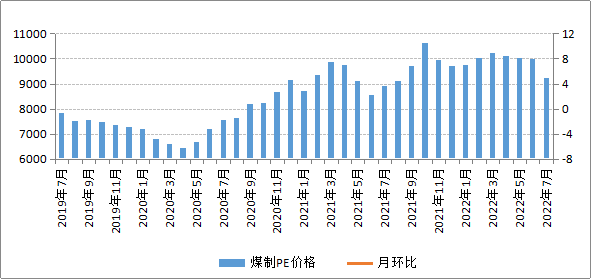 7月份,雖然PE生產(chǎn)企業(yè)檢修裝置較多,PE市場(chǎng)供應有所減少,但是由于7月份依然是PE行業(yè)傳統消費淡季,PE市場(chǎng)需求整體偏弱,市場(chǎng)多以低價(jià)成交為主,所以我區煤制PE價(jià)格小幅下降。7月份,我區煤制PE平均交易價(jià)格為9240.08元/噸,環(huán)比下降7.37%,同比上漲3.72%。