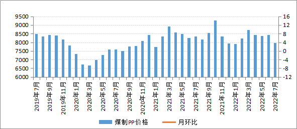 7月份,雖然煤制PP裝置檢修較多,PP市場(chǎng)供應壓力有所減小,但是PP下游需求持續偏弱運行,下游企業(yè)以逢低按需補庫為主,終端新訂單跟進(jìn)緩慢,PP市場(chǎng)交易氛圍整體較為清淡,推動(dòng)我區煤制PP價(jià)格小幅下降。7月份,我區煤制PP平均交易價(jià)格為7964.50元/噸,環(huán)比下降5.33%,同比下降4.47%。