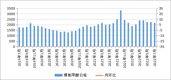 7月份,甲醇市場(chǎng)供應充裕,庫存處于較高位置,但是下游處于消費淡季,貿易商接貨積極性不高,廠(chǎng)家出貨壓力較大;另外,隨著(zhù)上游煤炭?jì)r(jià)格下降,甲醇成本支撐也在逐漸減弱,在以上因素共同作用下,我區煤制甲醇價(jià)格小幅下降。7月份,我區煤制甲醇平均交易價(jià)格為2149.15元/噸,環(huán)比下降3.60%,同比上漲5.50%。