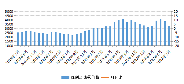 7月份,合成氨下游需求繼續走弱,企業(yè)多以剛需采購為主,合成氨市場(chǎng)供應壓力漸增,市場(chǎng)交易氛圍較為冷清,我區煤制合成氨價(jià)格繼續小幅下降。7月份,我區煤制合成氨平均交易價(jià)格為3269.36元/噸,環(huán)比下降15.05%,同比下降18.32%。
