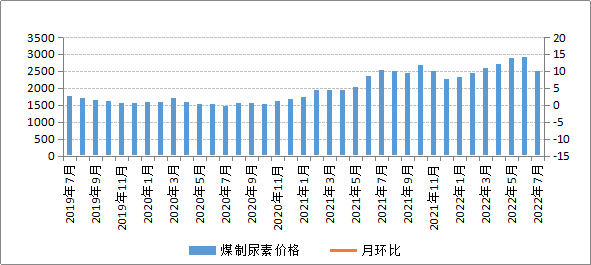 7月份,各地尿素農業(yè)需求陸續收尾,尿素農業(yè)采購量逐漸減少,而下游膠板行業(yè)因成品積壓以及近期降雨影響開(kāi)工率繼續走低,尿素工業(yè)需求較往年同期減少。同時(shí),7月份印度雖有尿素招標計劃,但在收緊的出口政策下對尿素市場(chǎng)行情暫無(wú)明顯利好支撐??傊?,雖然7月份尿素裝置檢修不斷,日產(chǎn)有所下降,但是在需求走弱的環(huán)境下,尿素供應壓力較大,推動(dòng)我區煤制尿素價(jià)格高位回落。7月份,我區煤制尿素平均交易價(jià)格為2509.08元/噸,環(huán)比下降14.25%,同比略降0.26%。