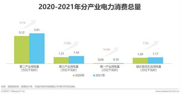 首先,根據艾瑞咨詢(xún)《2022年中國電力產(chǎn)業(yè)數字化研究報告》,2021年,我國全社會(huì )用電量達83129億千瓦時(shí),同比增長(cháng)10.5%。分產(chǎn)業(yè)看,受數字經(jīng)濟發(fā)展影響,以第三產(chǎn)業(yè)為首的新興領(lǐng)域用電需求陡增(如充換電服務(wù)業(yè)),2021年第三產(chǎn)業(yè)用電量同比增長(cháng)17.8%。然而電力生產(chǎn)增速放緩,2021年全社會(huì )用電量超出發(fā)電量約0.2萬(wàn)億千瓦時(shí)。
