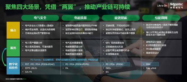“四大場(chǎng)景”即“電氣安全、電能質(zhì)量、能效雙碳、綜能微網(wǎng)”。施耐德電氣數字能源服務(wù)部總經(jīng)理楊平表示,施耐德電氣在服務(wù)領(lǐng)域有四大目標市場(chǎng),即建筑、工業(yè)、基礎設施和數據中心,而電氣安全、電能質(zhì)量、能效雙碳、綜能微網(wǎng)四大場(chǎng)景是支撐這四大目標客群可持續發(fā)展和數字化低碳轉型的關(guān)鍵支柱或者關(guān)鍵場(chǎng)景。
