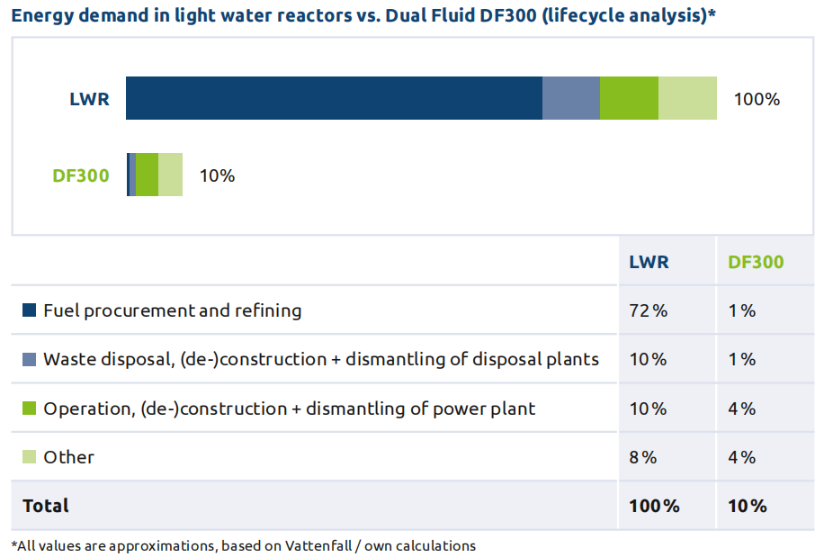 Dual Fluid認為,全世界普遍使用的輕水堆效率低下,因為只能把約1%的天然鈾轉化為電力。此外,核燃料在低溫下“燃耗”,不可能用于“有價(jià)值的高溫化學(xué)工藝”。