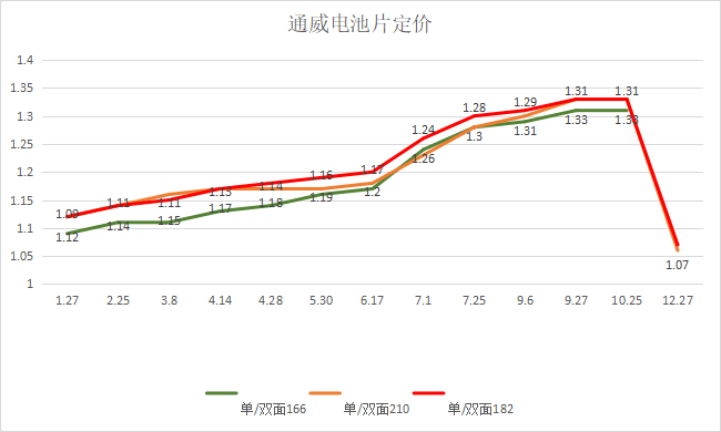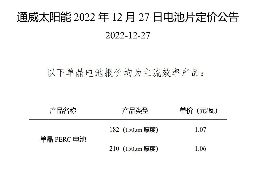 12月27日,通威太陽(yáng)能發(fā)布最新電池片定價(jià),182、210電池片現售價(jià)分別為1.07/瓦、1.06元/瓦。相比此前定價(jià),182、210電池片分別降價(jià)0.26、0.27元/瓦,降幅分別為19.5%、20.3%。