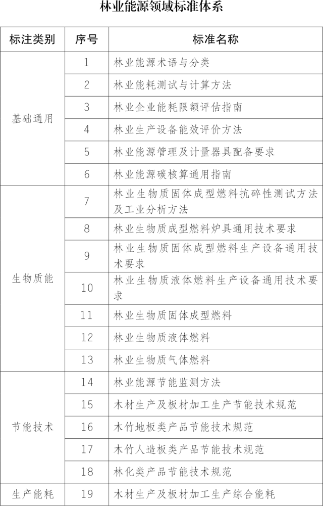 為深入貫徹《中華人民共和國標準化法》《中華人民共和國節約能源法》,更好地貫徹落實(shí)中共中央國務(wù)院《國家標準化發(fā)展綱要》《關(guān)于完整準確全面貫徹新發(fā)展理念做好碳達峰碳中和工作的意見(jiàn)》要求,以科學(xué)一流標準引領(lǐng)林業(yè)能源事業(yè)高質(zhì)量發(fā)展,按照國家和林業(yè)草原局黨組要求,對現有林業(yè)能源領(lǐng)域標準進(jìn)行了整合優(yōu)化,形成了《林業(yè)能源領(lǐng)域標準體系》,包括基礎通用、生物質(zhì)能、節能技術(shù)、生產(chǎn)能耗等四大類(lèi)。在標準制修定及實(shí)施過(guò)程中,要與時(shí)俱進(jìn),根據形勢發(fā)展和履職需要,不斷調整、充實(shí)完善。具體內容如下: