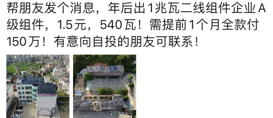 光伏們了解到,有行業(yè)消息顯示,某二線(xiàn)組件廠(chǎng)540W組件報價(jià)已經(jīng)來(lái)到1.5元/瓦,交貨周期為春節之后,但規模較小,僅為1MW。而在近日,亦有分布式光伏電站投資企業(yè)拿到了1.7元/瓦的組件成交價(jià)格,該訂單目前已經(jīng)開(kāi)始供貨。然而,也有組件銷(xiāo)售負責人告訴光伏們,剛簽了1.9元/瓦的組件訂單,但項目規模較小,為分布式光伏訂單,目前剛啟動(dòng)出貨。