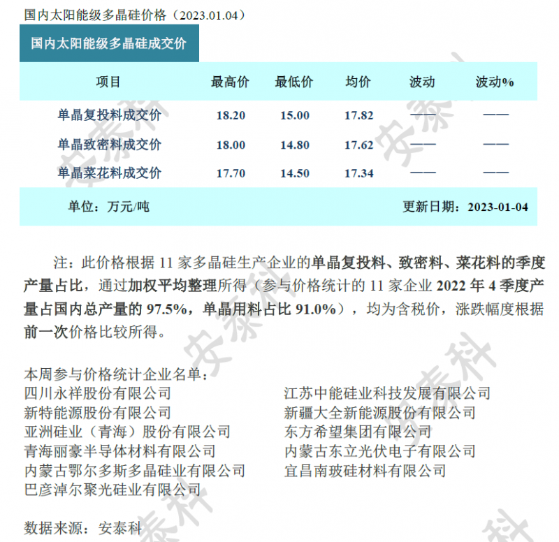 1月4日,硅業(yè)分會(huì )發(fā)布最新硅料成交價(jià)格,單晶復投料、致密料、菜花料市場(chǎng)最低價(jià)已來(lái)到14.5~15萬(wàn)元/噸,市場(chǎng)均價(jià)則來(lái)到17.8~17.3萬(wàn)元/噸。