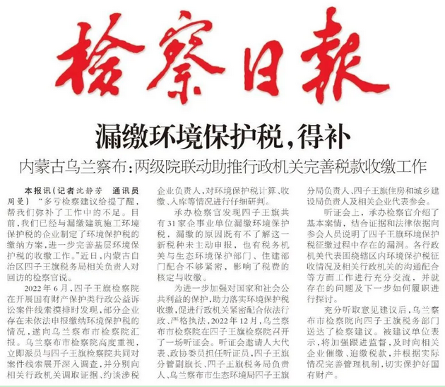 2022年6月,四子王旗檢察院在開(kāi)展國有財產(chǎn)保護類(lèi)行政公益訴訟案件線(xiàn)索摸排時(shí)發(fā)現,部分企業(yè)存在未依法申報繳納環(huán)境保護稅的情況,遂向烏蘭察布市檢察院匯報。烏蘭察布市檢察院高度重視,立即派員與四子王旗檢察院共同對案件線(xiàn)索展開(kāi)深入調查,并分別向相關(guān)行政機關(guān)調取證據、約談涉稅企業(yè)負責人,對環(huán)境保護稅計算、收繳、入庫等情況進(jìn)行仔細研判。