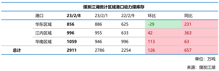 據煤炭江湖統計數據顯示,上周華東、華南及江內港口動(dòng)力煤庫存為2911萬(wàn)噸,周環(huán)比增加了126萬(wàn)噸,比去年同期大幅增加了657萬(wàn)噸。其中華東地區動(dòng)力煤庫存較上期減少29萬(wàn)噸,由于港口堆存場(chǎng)地緊張且倒掛嚴重,因此從產(chǎn)區發(fā)運到港量有所下降。江內和華南地區動(dòng)力煤庫存分別比上期增加了42萬(wàn)噸和113萬(wàn)噸,目前下游工業(yè)需求尚未達到預期水平,需求采購寥寥無(wú)幾,港口出貨量較少,導致庫存持續的積累。