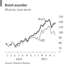 與此同時(shí)其他地區情況也出現了變化,在2月,從加拿大擁有含油砂的地區連通了一條新的石油管道,而北達科他的巴肯地區的頁(yè)巖油的大量供應也超過(guò)了人們預期,而且都正巧趕上美國的石油需求不旺。同時(shí)由于在規劃方面出現了困難,使得原本提議在庫欣與墨西哥灣的煉油廠(chǎng)(從那可以將石油運往海外)之間建一條新的石油管道最早也要到2013年才能完工。至于嘗試通過(guò)公路和鐵路來(lái)進(jìn)行石油運輸,對于正不斷增加的石油庫存來(lái)說(shuō)也只是杯水車(chē)薪。