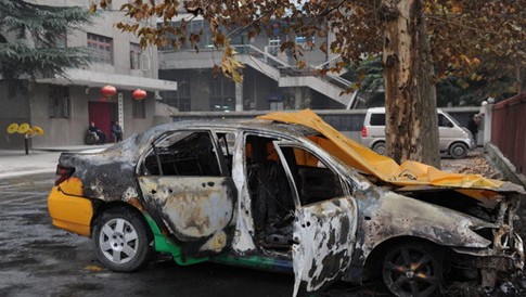昨日下午,在老年公寓門(mén)前,被燒得面目全非的出租車(chē)蓋著(zhù)一張塑料布,滿(mǎn)地都是撲救時(shí)留下的污漬和水。據介紹,當時(shí)著(zhù)火車(chē)輛兩側是兩輛面包車(chē),由于溫度太高,靠近火源的一側塑膠構件都熔化了。