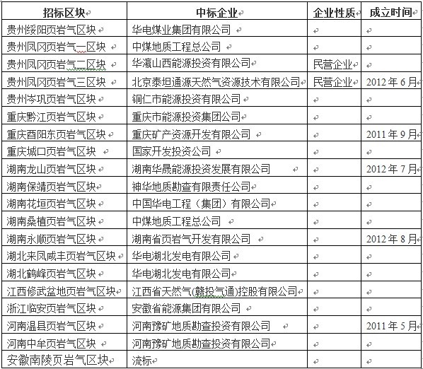 地方能源投資企業(yè)中標本省的頁(yè)巖氣區塊,比率非常高。如貴州岑鞏頁(yè)巖氣區塊中標企業(yè)為銅仁市能源投資有限公司、重慶黔江頁(yè)巖氣區塊中標企業(yè)為重慶市能源投資集團公司、重慶酉陽(yáng)東頁(yè)巖氣區塊中標企業(yè)為重慶礦產(chǎn)資源開(kāi)發(fā)有限公司、湖南龍山頁(yè)巖氣區塊中標企業(yè)為湖南華晟能源投資發(fā)展有限公司、江西修武盆地頁(yè)巖氣區塊中標企業(yè)為江西省天然氣(贛投氣通)控股有限公司、河南溫縣頁(yè)巖氣區塊中標企業(yè)為河南豫礦地質(zhì)勘查投資有限公司。