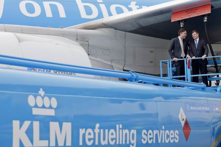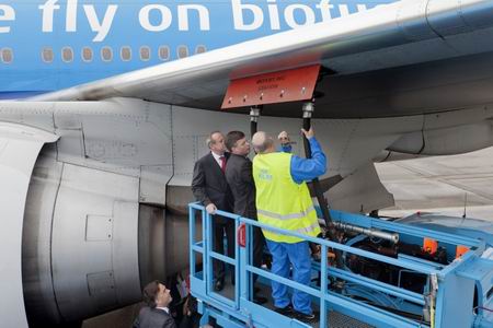 3月8日,在荷蘭阿姆斯特丹,荷蘭前首相巴爾克嫩德(中)參觀(guān)即將起飛的荷蘭皇家航空公司最新生物油燃料航班。