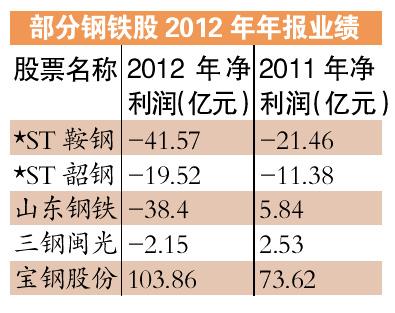 截至目前,已有包括*ST韶鋼(000717),*ST鞍鋼(000898)、山東鋼鐵(600022)、新興鑄管(000778)等多只鋼鐵股公布了2012年的業(yè)績(jì),從年報披露的情況來(lái)看,“大幅虧損”是很多鋼鐵股年報的共同主題詞。其中虧損幅度最大的分別是:*ST鞍鋼虧損41.57億元;馬鋼股份(600808)虧損38.63億元;山東鋼鐵虧損38.36億元;安陽(yáng)鋼鐵(600569)虧損34.98億元;*ST韶鋼虧損19億元。