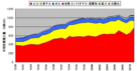 一、1980-2011年日本發(fā)電量構成(黃色為核電)