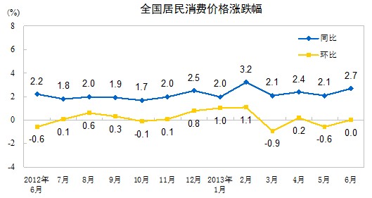 2013年6月份,全國居民消費價(jià)格總水平同比上漲2.7%。其中,城市上漲2.6%,農村上漲2.8%;食品價(jià)格上漲4.9%,非食品價(jià)格上漲1.6%;消費品價(jià)格上漲2.6%,服務(wù)價(jià)格上漲2.7%。上半年,全國居民消費價(jià)格總水平比去年同期上漲2.4%。