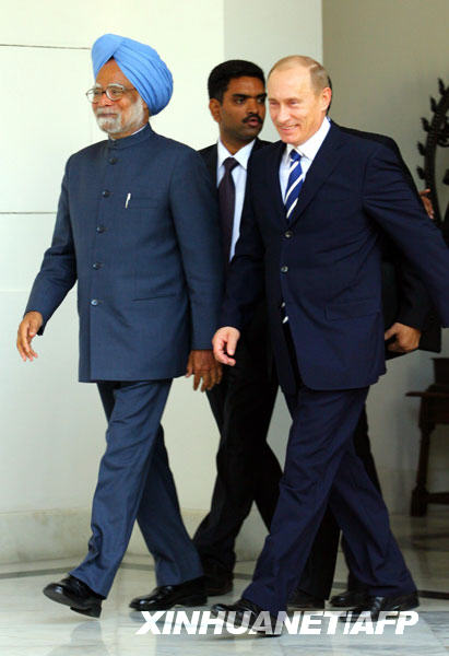 俄羅斯總理弗拉基米爾·普京定于3月11日抵達印度進(jìn)行訪(fǎng)問(wèn),這是他就任總理后首次訪(fǎng)問(wèn)印度。俄羅斯一名高級官員說(shuō),普京訪(fǎng)問(wèn)印度期間,兩國將簽署超過(guò)100億美元的合同。這是時(shí)任俄羅斯總統的普京(前右)在新德里與印度總理辛格共同出席會(huì )議的資料照片(攝于2007年1月25日)。新華社/法新