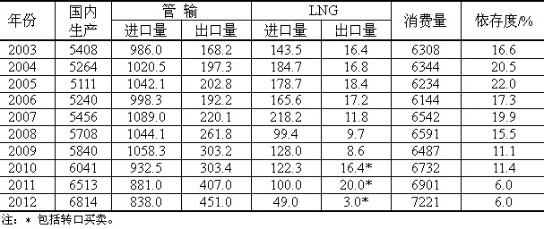 美國是天然氣生產(chǎn)大國,也是天然氣進(jìn)口大國。天然氣產(chǎn)量和消費量逐年增高,進(jìn)口天然氣有所下降,但不明顯,美國仍然是液化天然氣進(jìn)口國,天然氣對外依存度2012年與2011年保持一樣。