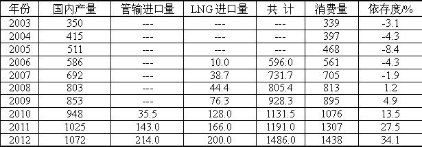 中國天然氣進(jìn)口逐年增加,對外依存度也隨之增加,到2012年中國天然氣對外依存度增加到34%,比中國石油對外依存度增加得快。