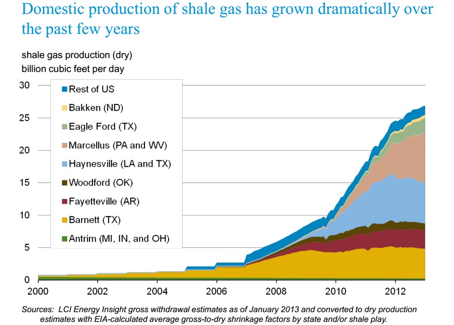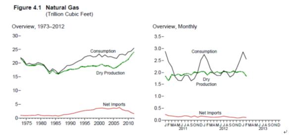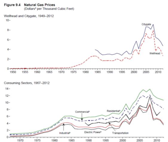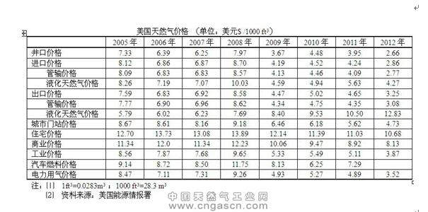 美國頁(yè)巖氣資源儲備豐富,產(chǎn)業(yè)發(fā)展成熟,其產(chǎn)量在過(guò)去的幾年里出現了跳躍性的增長(cháng),2012年的總產(chǎn)量達到27億立方英尺每日的產(chǎn)量,增長(cháng)率在所有天然氣產(chǎn)品中位列首位。頁(yè)巖氣的彭勃發(fā)展帶動(dòng)美國天然氣產(chǎn)量大幅度提高,在1990年至2011年期間年增長(cháng)率達1.3。頁(yè)巖氣產(chǎn)量的劇增帶動(dòng)天然氣價(jià)格波動(dòng),由表可看出,美國的消費端的平均天然氣價(jià)格隨著(zhù)頁(yè)巖氣產(chǎn)量的提升在2008年出現峰值后,一路下跌。以居民消費端的天然氣價(jià)格為例,2008年的峰值價(jià)格為13.89美元每千立方英尺,而2013年2月的價(jià)格下降到了9.24美元每千立方英尺。